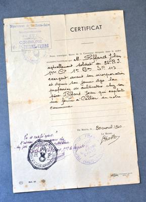 Certificat délivré par le maire de Saint-Pierre Eynac (Haute-Loire) attestant de la profession de cultivateur de Julien Riffard, daté du 30 avril 1940.