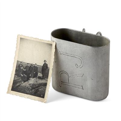 Quart en aluminium, sur lequel sont gravées sur une face les initiales RJ.