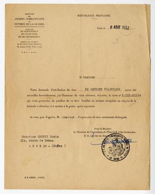 Lettre d'attribution au titre de déporté politique au nom de Louis Croppi