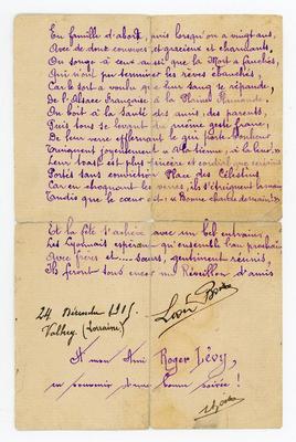 Poème manuscrit "Réveillon" rédigé du front en Lorraine et dédicacé à Roger Lévy (2/2)