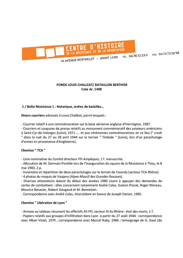 - Papiers personnels de Louis Challéat : carte FFI ; ordre de mission, 16 octobre 1944 ; ordre de bataille, 9 décembre 1944, signé de sa main ; lettre du commandant Berthier relative au soldat Vincent Soler, grièvement blessé, 23 septembre 1944.