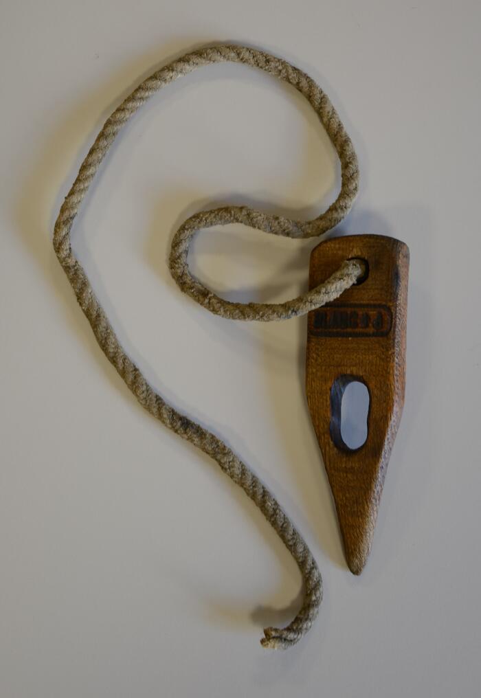 Dimensions : H. 16 cm x L. 4,5 cm (Pièce de bois) 74 cm (Corde)